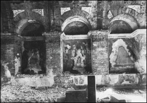 Spreng- und Brandbomben hatten im Jahre 1944 die Glyptothek schwer beschädigt. Die Museen (Glyptothek, Alte und Neue Pinakothek) und Kirchen in der Umgebung des Königsplatzes waren allesamt schwer durch die alliierten Bombardements beschädigt worden - die Parteigebäude der NSDAP am Königsplatz blieben dagegen verschont. Doch nicht nur die Luftangriffe zerstörten das Gebäude: Gegen Kriegsende plünderte die Bevölkerung die Ruine. Auch Wind und Wetter setzten dem Gebäude arg zu, da erst 1953 ein provisorisches Dach für die Glyptothek fertig gestellt wurde. Glücklicherweise blieben die meisten Ausstellungsstücke verschont, da sie bereits bei Kriegsbeginn ausgelagert worden waren.